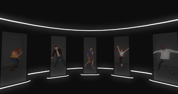 Sixteen randomly selected fans of the pop singer, Michael Jackson, performed in a studio and recorded a full album, Thriller. These videos were then played on individual screen's in a dark room.